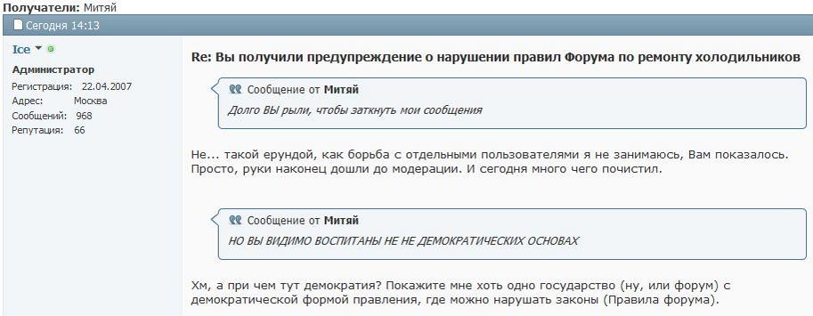 Судя по всему, на этой почве Митяй решил вообще с нашим форумом завязать. Это я понял из его последних сообщений и нашей с ним переписки, которая случилась сегодня (см. ниже).