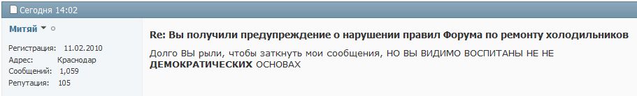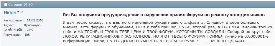 Наверно курнул (хлебнул) Митяй, с кем не бывает, может одумается извинится. Только уж больно понесло его, бывали у меня с ним виртуальные стычки и по жёстче, но он так не кипятился. А не может быть , что кто-то ломанул форум и от его имени с админом в перепалку..? По активности он типаж заметный подходящий. Память не изменяет, форум недавно хвалил, с чего вдруг такое.
