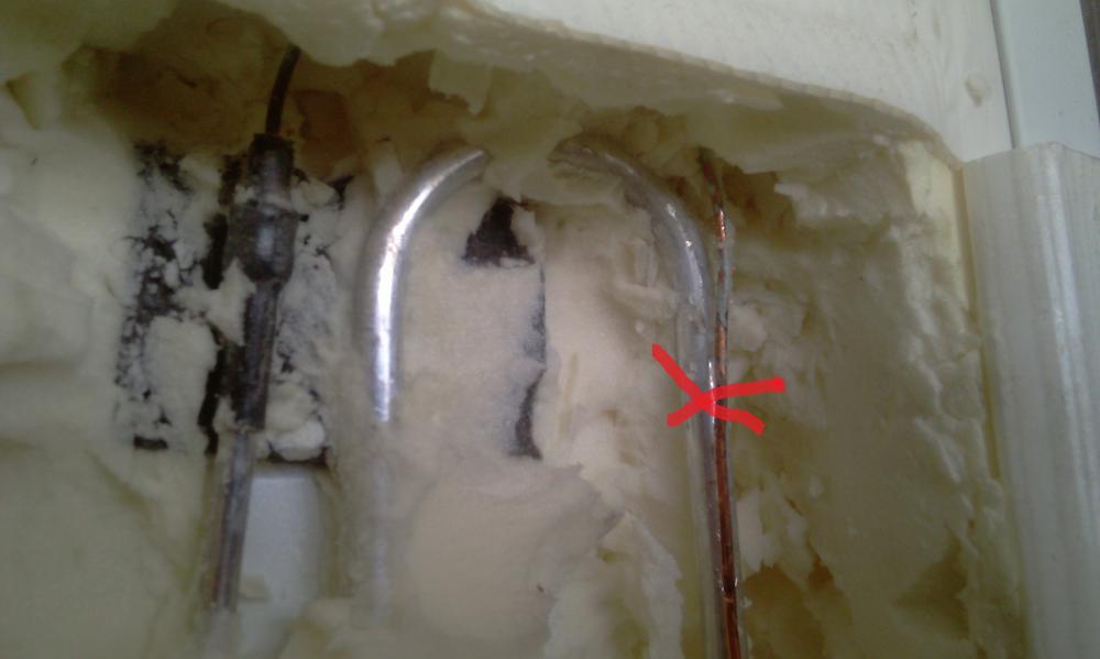 Холодильник Stinol 306A - однокомпрессорный, двухкамерный с плачущим испарителем. Проблема - утечка фреона. Долго не мог отыскать, фонит постоянно в разных местах, то спереди, то внутри, то сзади. В итоге добрался до запенки. Вскрыв плачущий испаритель, обнаружил: