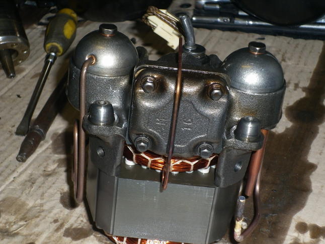Этой конструкции м-к уже много лет, это Малазия вроде бы и стоят они на Стинолах 90-тых. Всасывание происходит через один глушитель, там и трубка медная торчит, а нагнетание через другой глушитель. А это капиллярка предназначена для выдавливания масли из клапанной группы. Смазка кулисной группы происходит через кривую стальную трубку, которая находится постоянно в масле. Конструкция очень долговечная конечно, не то что сейчас делают.