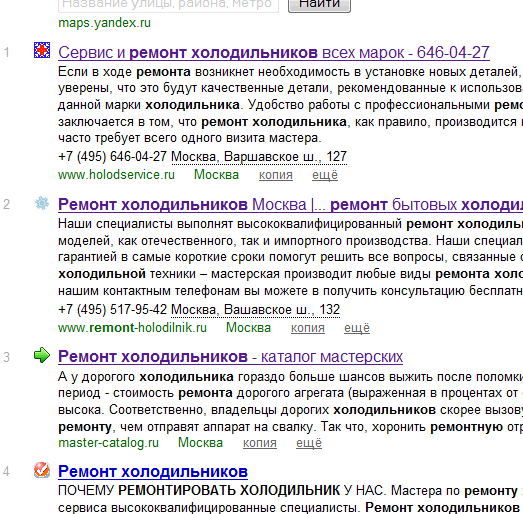 Вы это Ice-у объяснили сейчас? Если так, то Вы наверное за последние лет несколько ни разу не набирали в Яндексе запрос "ремонт холодильников", если решили, что он не в курсе. Я не знаю, как этот запрос из регионов виден, а что из Москвы видно я сфоткал (третье место):