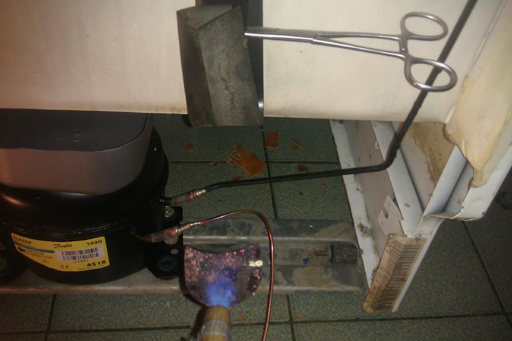 Немного дополню сообщение N58. Прихожу на ремонт, спрашиваю: - есть чем пол застелить, если нечем, тогда давайте противня с духовки "листы" для пирожков, один на пол другой по надобности прикрыть холодильник. Фо. применился подпирать трубкой, место пайки капилляра в трубку, другой стороной в противень на полу.