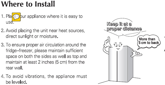 В инструкции указано - оставить сзади 5см, а также по бокам и сверху. А сколько по бокам и сверху не указано. Будет стоять не у стены, так что дверцы будут сводободно открываться.