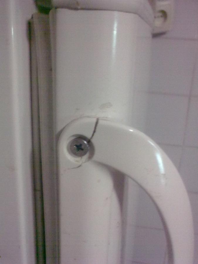 Продолжу тему ремонта пластика. Речь пойдет о ручке ХК х-ка Снайге. Материал тот же. Технология несколько сложнее. Чтобы соединить две половинки треснувшей детали, нужно просверлить два глухих отверстия и вставить стальную шину (английская булавка). Заливаем супером, шлифуем, красим (3 раза). Результат перед вами. Кстати, холодильник мой.