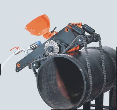 Есть куча всяких бодрых труборезов (пример на втором фото), но они все не без стружки. Если без стружки, то можно соорудить вариацию на тему огромного роликового трубореза типа тех, которыми мы трубки в холодильниках режем (см первое фото). Если хорошо проработать конструкцию, то и овальность не будет помехой. Только, что-то мне подсказывает, что окупится такой труборез не очень скоро