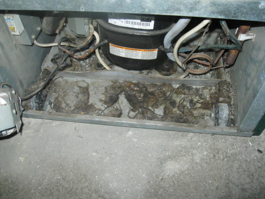 Не перегрыз вроде ничего. Просто каким то чудом залез с низу на компрессор а почему не вылез, когда компрессор запустился, я не совсем понял. Мб его собаки туда загнали...