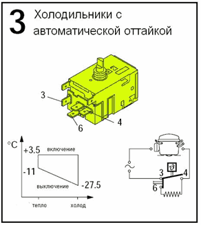 Ну если кто видел подробную таблицу настроек терморегуляторов, то она имеет три градации в зависимости от положения регулировочной ручки (даже риски ставят для "Норм"): малый холод, средний (норма), и максимальный. И на каждый режим имеется положение " температуза замыкания" и "температура размыкания". Так вот, всегда включение будет на +4...5. У Бабакина и Выгодина можно увидеть такую таблицу. Жаль она не обновлялась наверное с 80-х годов. Уже до 125 градуировки ассортимет вырос.